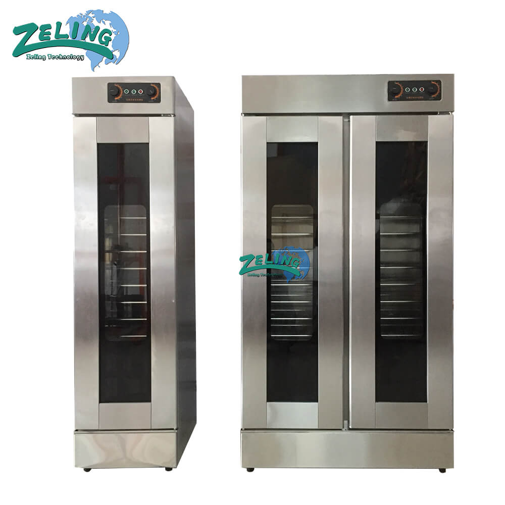 Proofer is an electrothermal product designed according to the principle and requirement of bread fermentation. It uses electric heat pipe to heat the water of the water pan in the box through temperature control circuit to produce the most suitable fermentation environment with relative humidity of 80-85% and temperature of 35-40 degrees centigrade. It helps to shape conveniently and use safely and reliably. It is an indispensable supporting equipment for improving the quality of bread production.