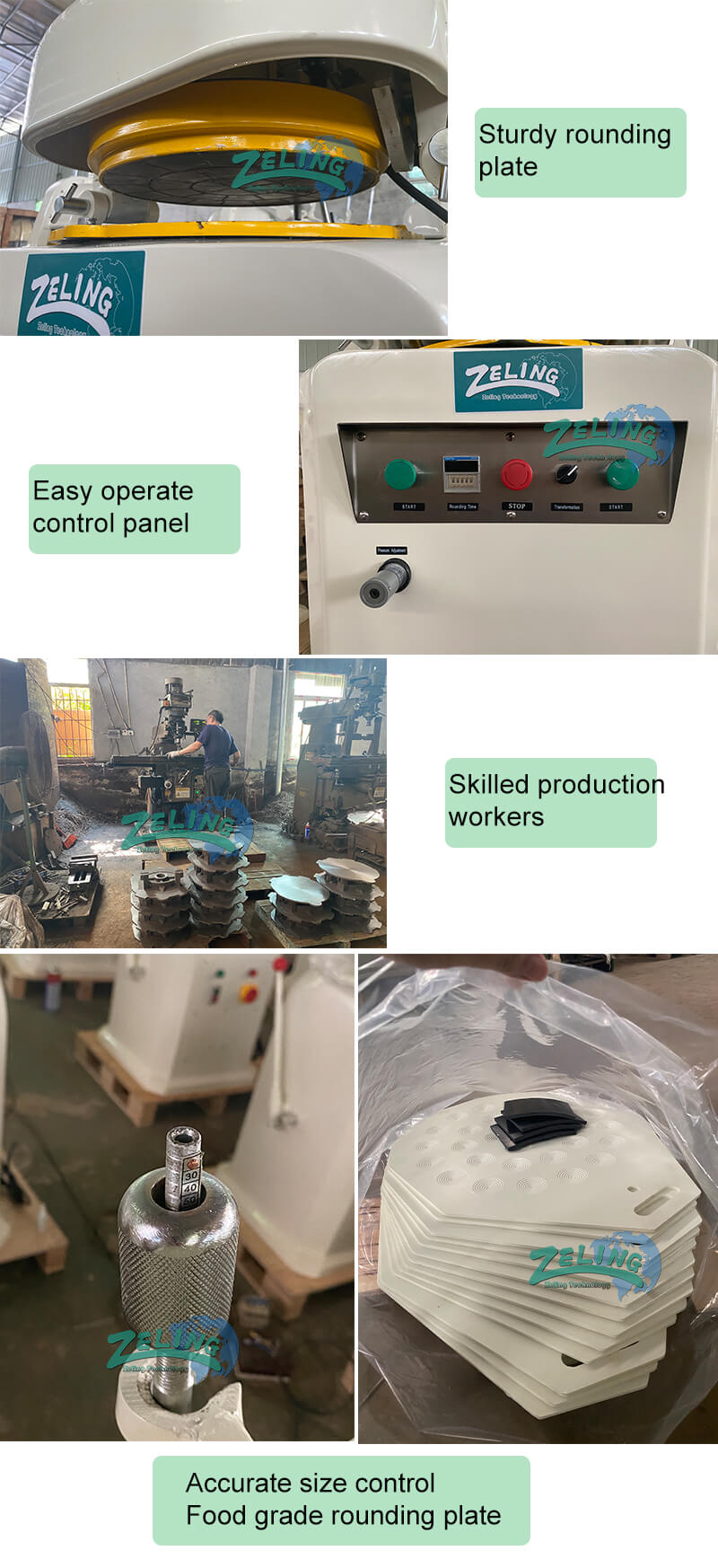 This machine can divide and round the dough automatically, it can divide completely with none stick plate, the rounding effect is very well. It is a very good machine for making burger, bun, pizza , bread roll etc. It is high efficient and popular and with long last lifetime.