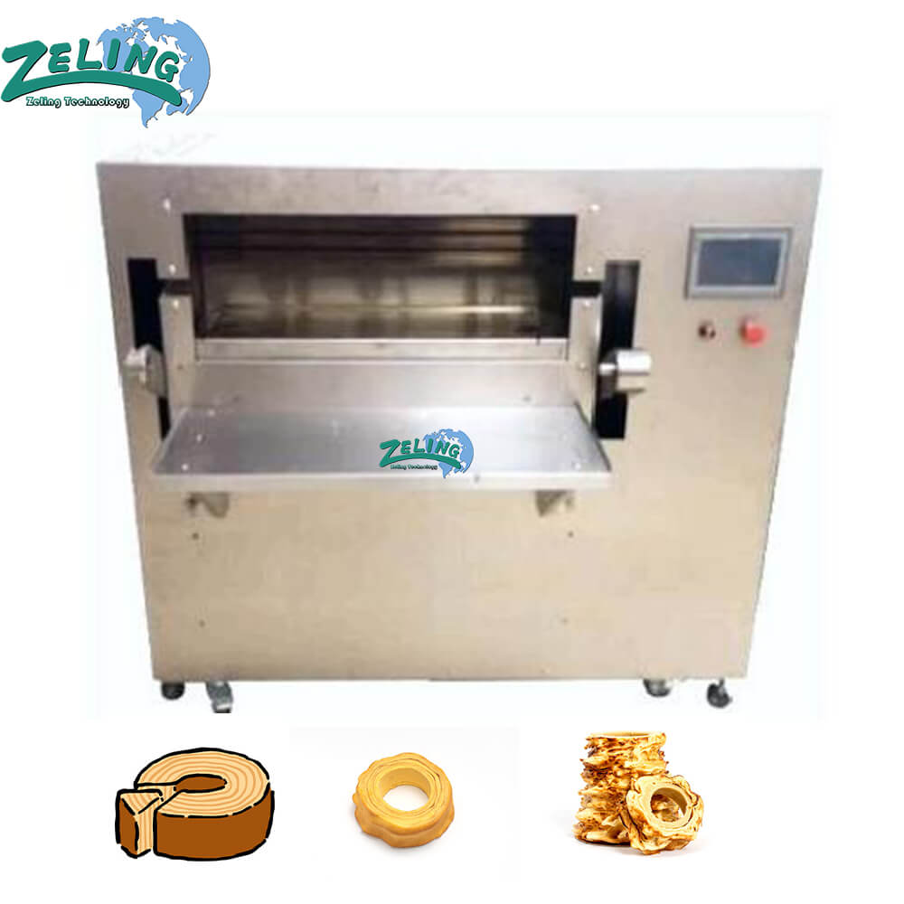The Baumkuchen Machine is a specialized rotary baking oven designed for creating the iconic German “Tree Cake” (Baumkuchen). It features a rotating spit that slowly turns in front of a heating element. Layers of batter are sequentially applied and baked to golden perfection, resulting in the cake’s characteristic concentric rings that resemble tree growth rings. This machine automates the traditional labor-intensive process, ensuring consistent, high-quality layers and perfect cylindrical cakes ideal for glazing and slicing.