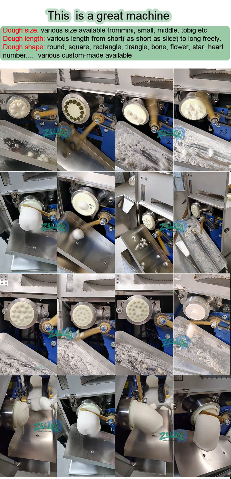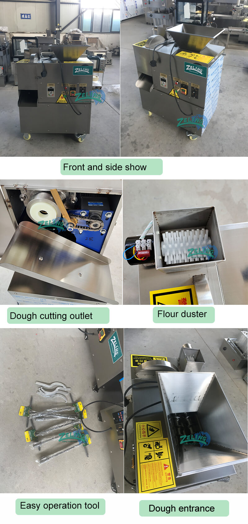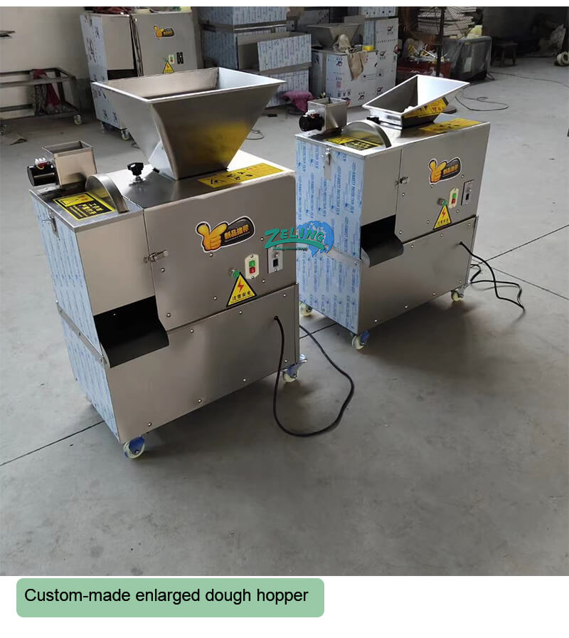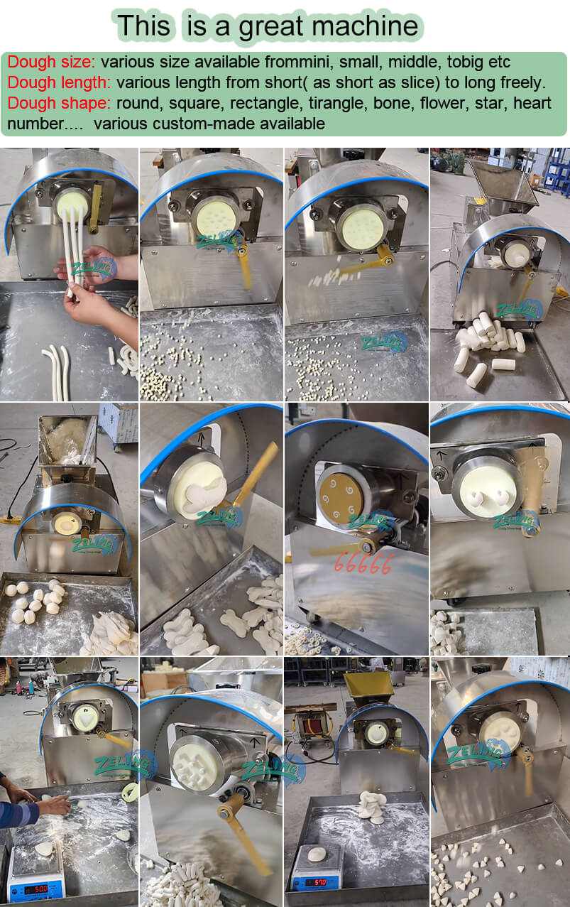 Dough divider machine suit for many areas: biscuits, bread ,tapioca pearls, taro balls, hanging furnace biscuits, steamed buns, dumpling bread, moon cakes and others. products developed according to customer needs. The dough is processed into balls through the national method of extrusion, conveying, shearing and spheronization.Well formed, smooth in appearance, does not damage the gluten, and has a good use effect.Because the machine is equipped with a quasi-speed governor, the speed is high. Can do 5-500g dough ball and can through mold to do different dough ball.