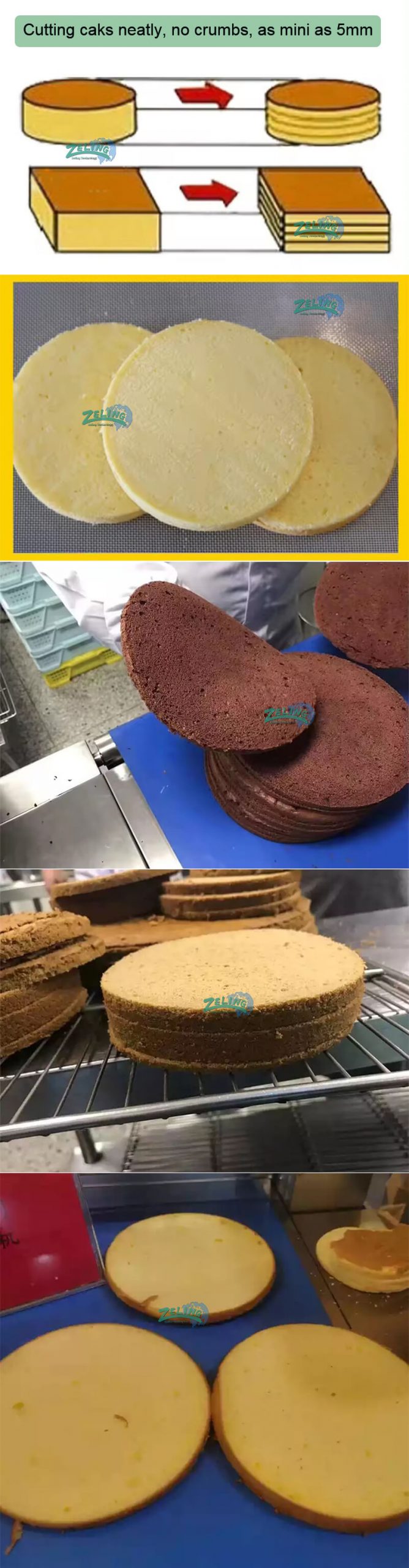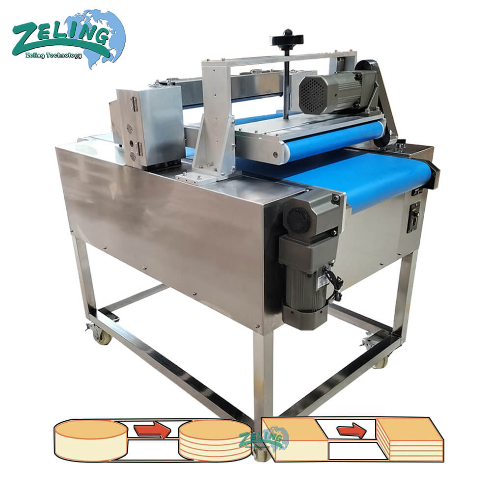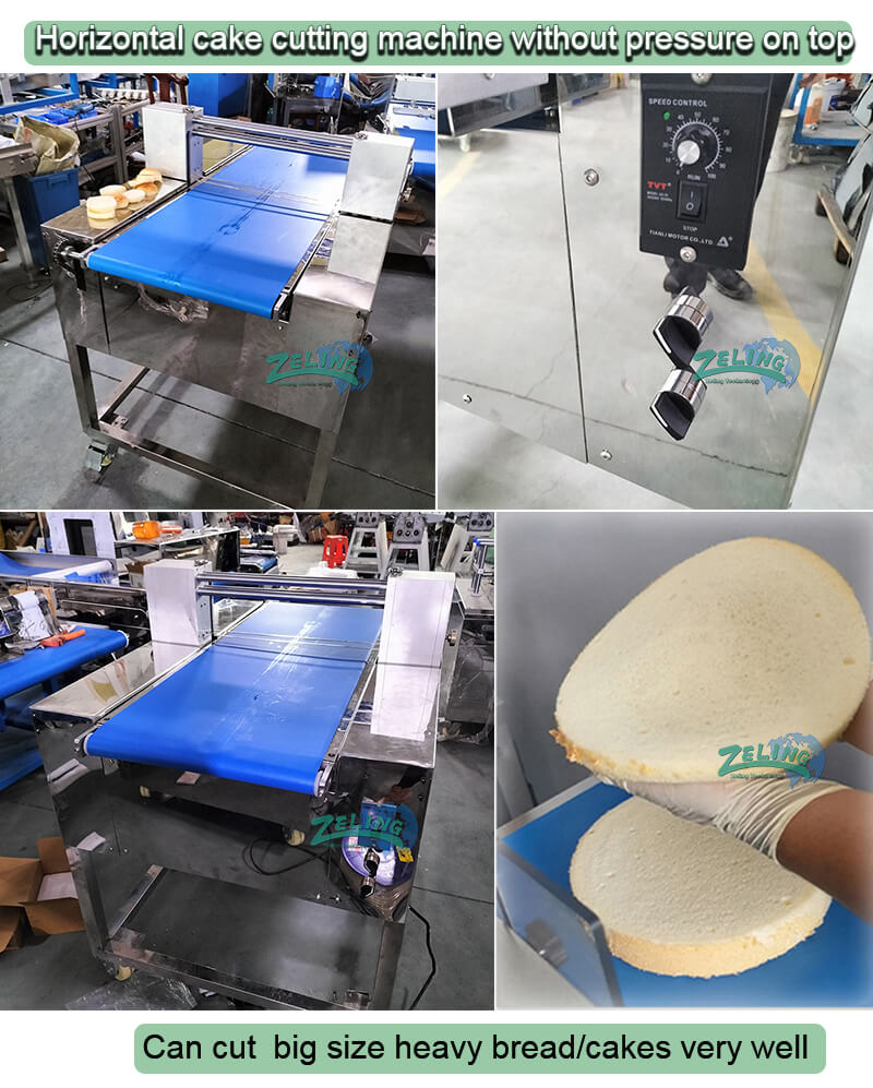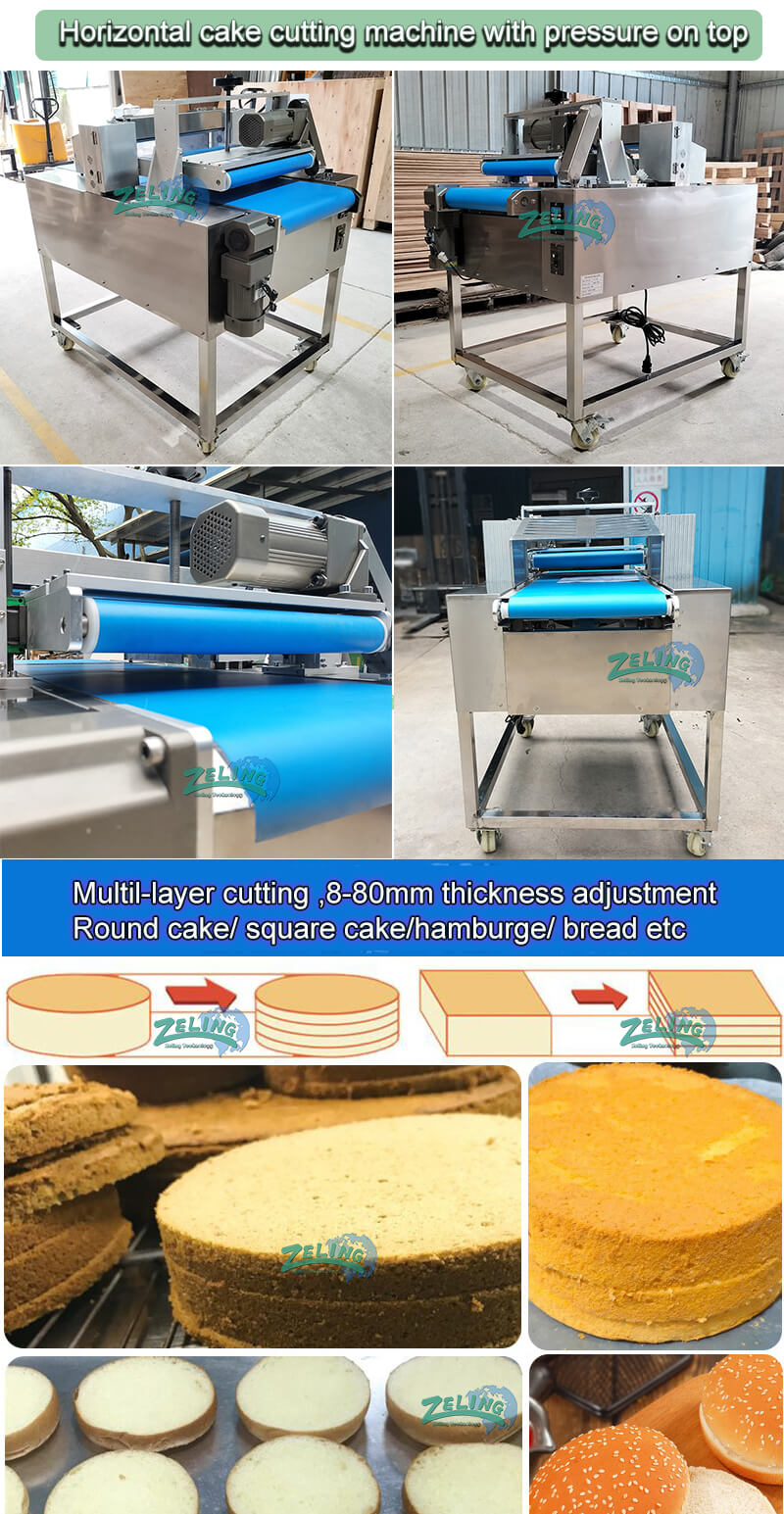 This horizontal cake slicer is built to precisely and efficiently cut products into horizontal slabs. Slice off the top of a cake for an evenly cut professional look. Increase production and lower costs by baking one cake and slab cutting it into several thin layers for a layer cake.this machine could install 4 or 5 blades simultaneously to slice consistent layers from 5mm to 100mm.it is great for a bakery producing layers cakes or slicing the top crown off of cake products , or slicing hamburger into 2 lalyers .