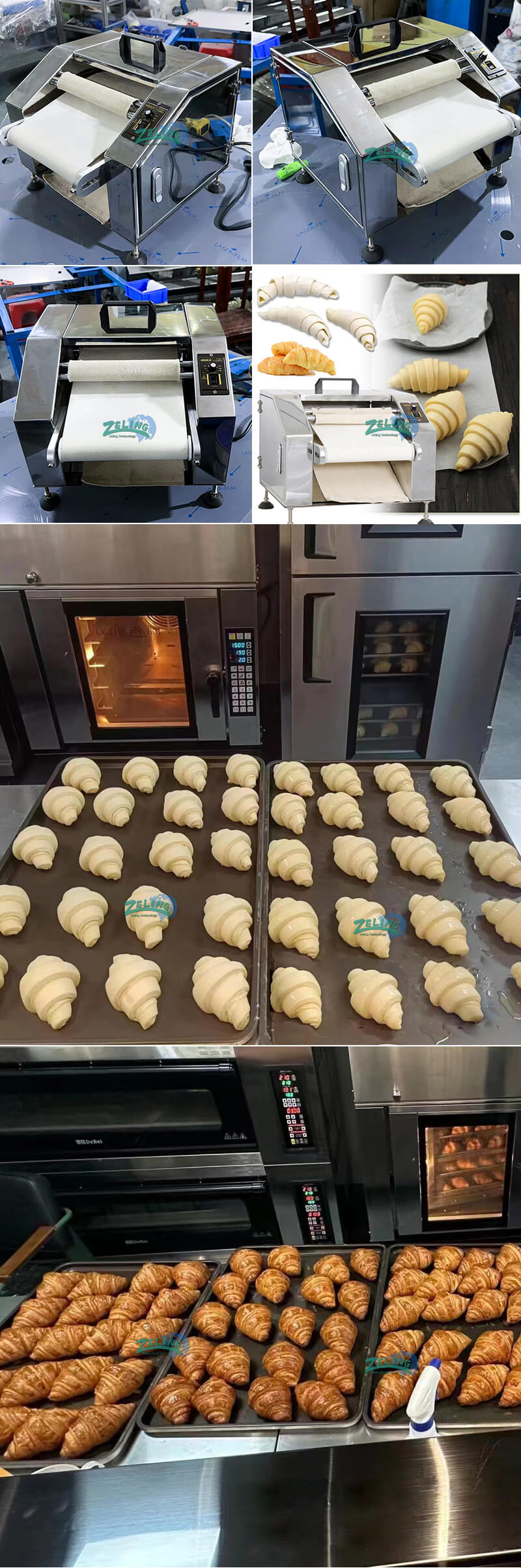 This machine is for rolling croissant bread. The worker place the cut dough sheet on the conveyor, the machine can roll the dough sheet automatically.
