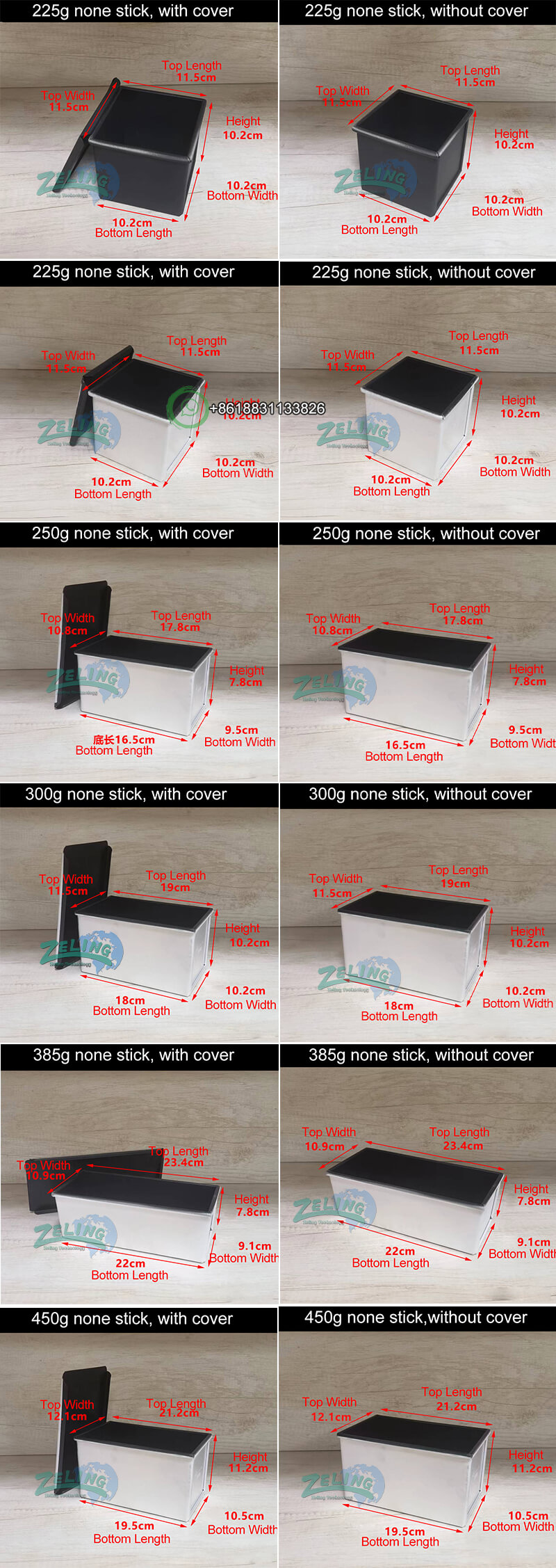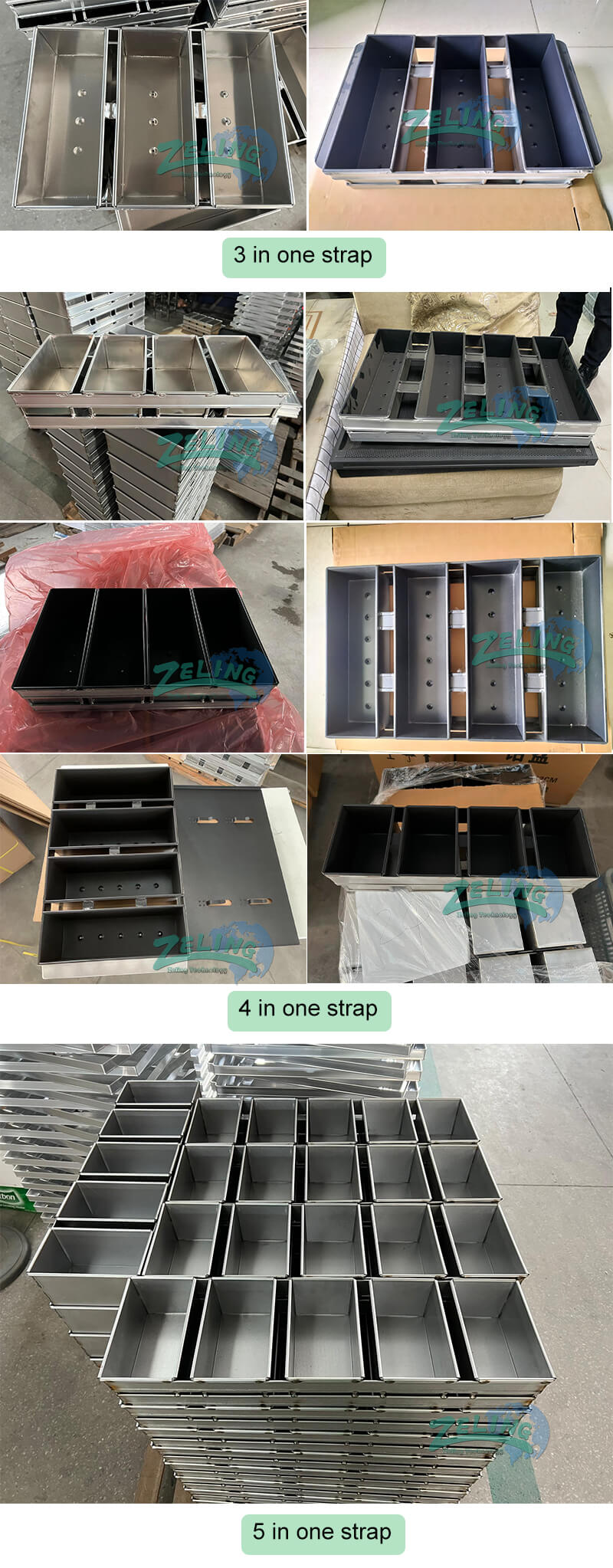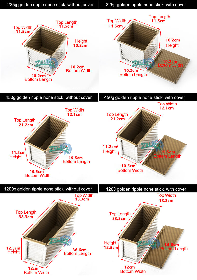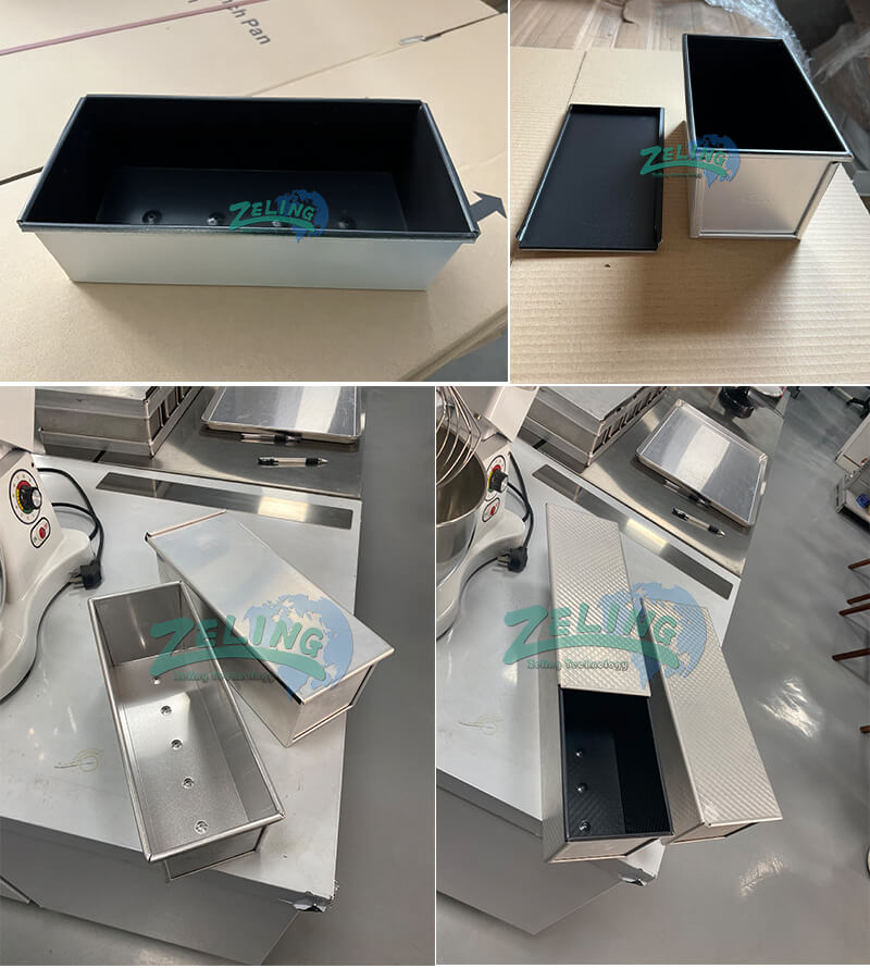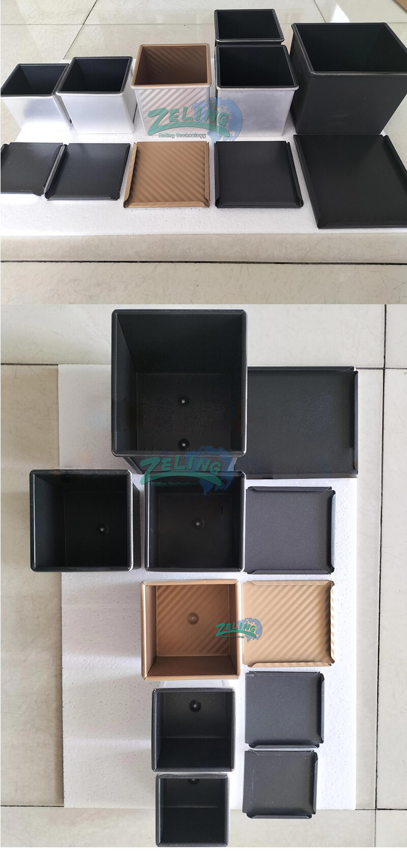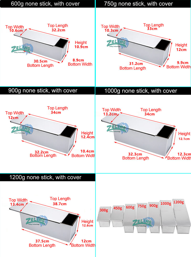 The toast box can be 250g, 450g, 750g, 900g, 1000g, 1200g etc. You can choose with cover or without cover; the inside surface usually has nonstick coating. The box can be straps like 3 in 1 strap, 4 in 1 strap, 5 in one strap etc; we can customize as your request.
