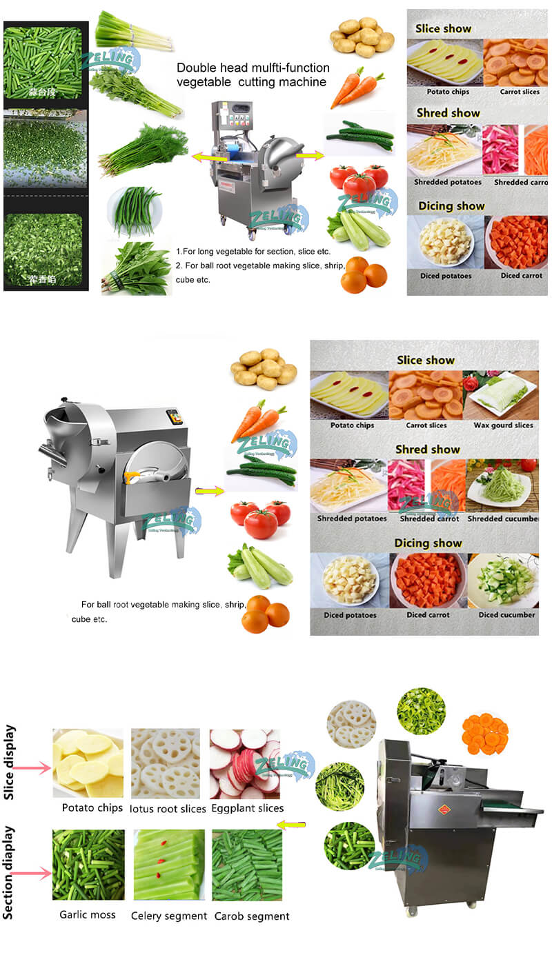 the vegetable cutting machine machine has double head , both ends can work at the same time! The one head cut long vegetables, such as cabbage, leek, green bean, celery, and so on, the other head cut potato, cucumber, eggplant, carrot, radish , melon and fruit. could work by slice, shred and dice.